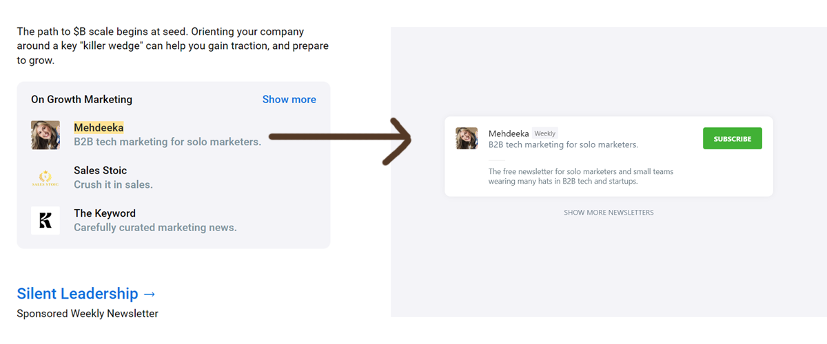 Substack isn’t supported, so I’d have to manually import new subscribers. I found the experience pretty lacking. As a reader, you get the ad in your inbox, get taken to a landing page created by Refind which has no writing samples, and simply has a subscribe button.