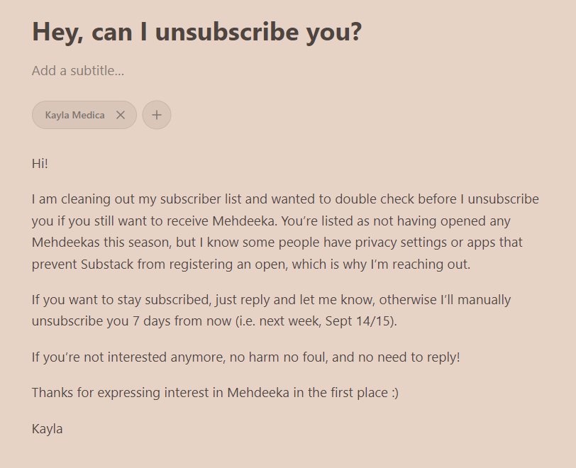 But reaching success didn’t really feel good, because getting ghosted or being told my newsletter wasn’t worth how much I was asking for a subscription counted for a lot more in my head. Even though I kept telling myself that Mehketeers are a niche within a niche, within another niche, and that I also didn’t really care about numbers!
