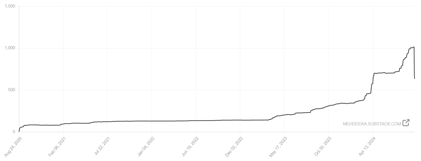 Anyway, here’s a look at my subscriber growth over the entirety of this newsletter existing. I’ve run it in seasons ever since the very beginning, so the plateaus are the breaks where I’m neither publishing nor promoting. There was also a 12-18 month break where I had thought I was done with this thing.