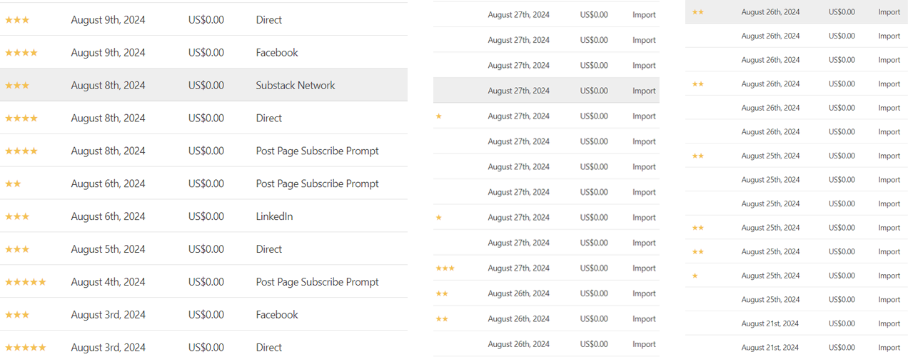 LinkedIn is difficult because of the “no links” rule, however the conversion rate is closer to 8% and although the data says they have below average star ratings according to Substack, my gut says the quality of subscribers is high/targeted