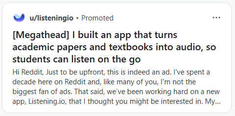 Organic looking text posts on Reddit can take a lot of formats. Major subreddits often have rules about what the headline of a post should be, for example. Things like [TIL] (today I learned), [Megathread] (meaning that too many posts have been made about the same topic, and theyâre being replaced with this megathread), or [ELI5] (explain like Iâm 5) are common tropes to use on ads: