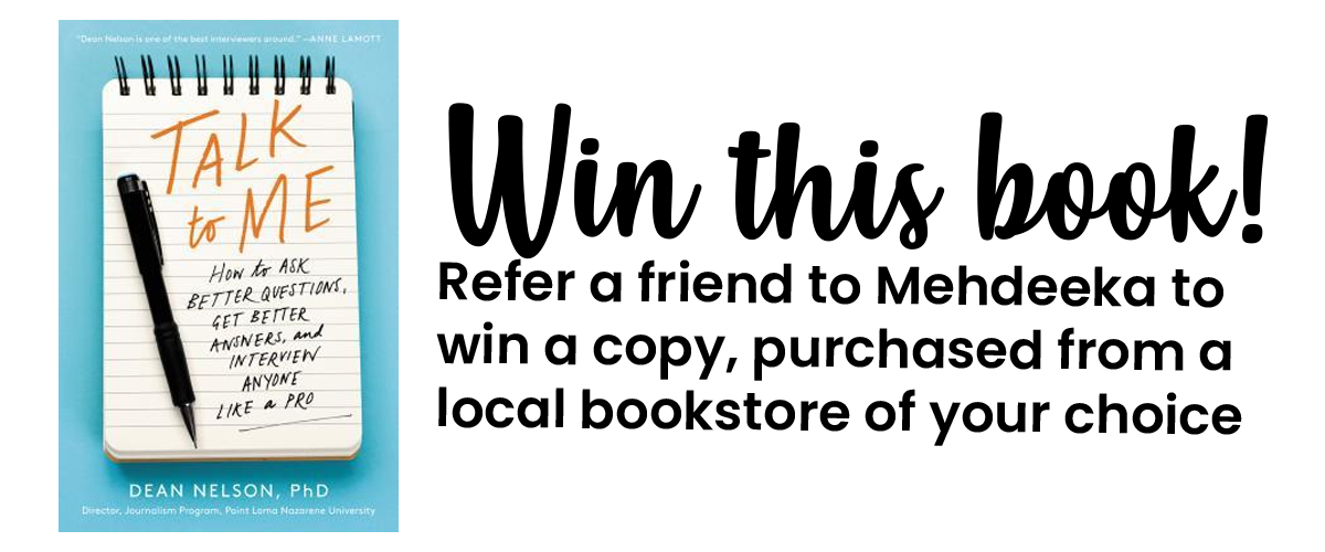 Each week there’s a different book up for grabs for people who refer friends and colleagues. This issue’s book is: Talk to Me: How to Ask Better Questions, Get Better Answers, and Interview Anyone Like a Pro by Dean Nelson. I finished this recently and took a lot from it. Dean Nelson is a journalist and professional interviewer, and his insights on how to get people to answer questions, stay in control of an interiew, and ask the right questions are super relevant for marketers who conduct market research, customer interviews, or any other research work.