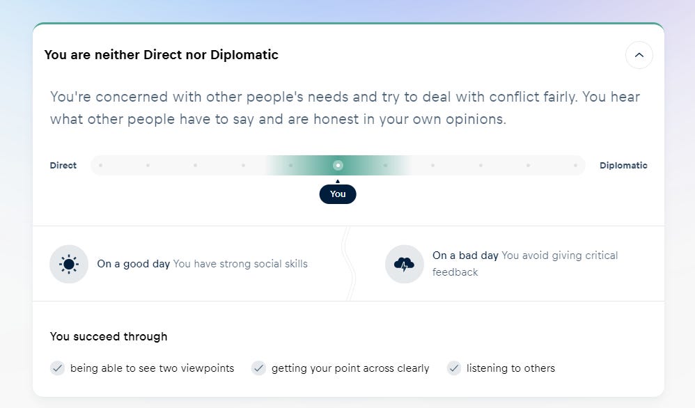 The second quiz I was reminded about is this one from Teal. It’s more about what style of working you fit best into, and the idea is to give you this insight so when you go into a job interview you can ask culture based questions to assess whether the company’s working style is one you’ll do well in (or find really draining.)